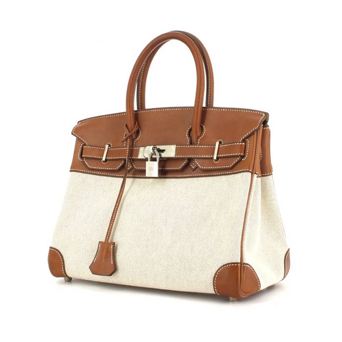 Encantador bolso de mano "Birkin 30 cm" de lona beige y de cuero Barenia marrón, adorno en metal paladio, sobrecosturas beige, doble asa de cuero marrón para llevar en la mano.