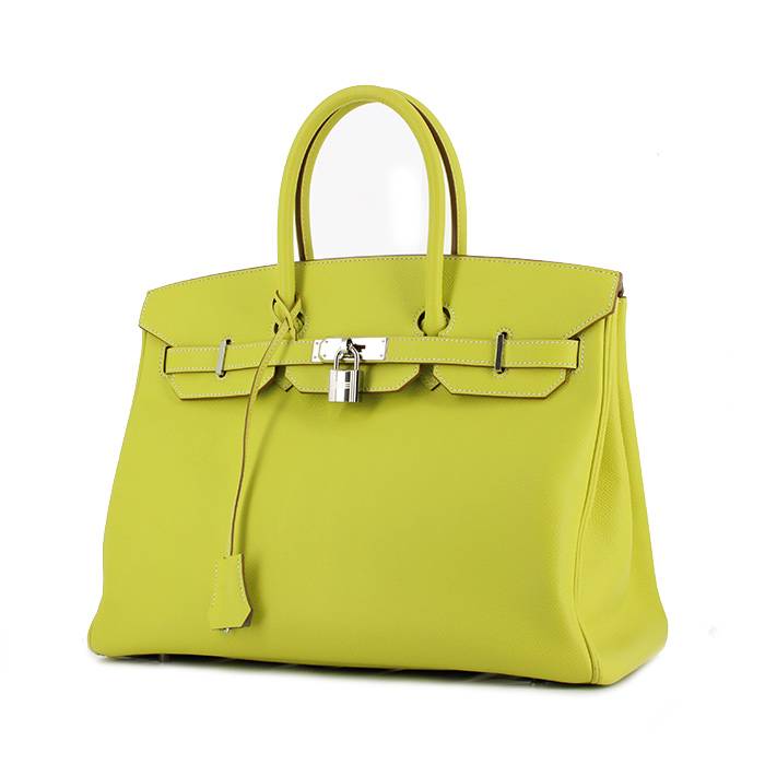 Bonito bolso de mano "Birkin 35 cm" de cuero epsom verde, adorno en metal plateado, doble asa de cuero verde para llevar en la mano.
