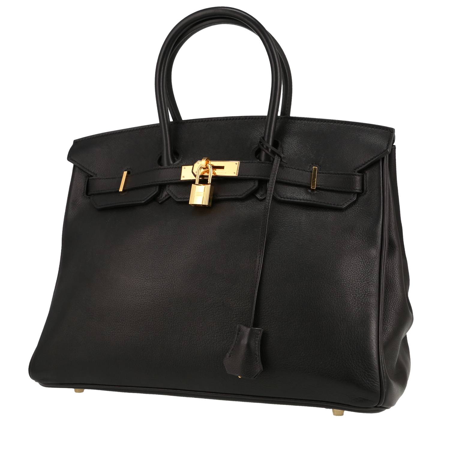 Excepcional bolso de mano Hermès Birkin 35 cm de cuero Evergrain negro, adorno en metal dorado, doble asa de cuero negro para llevar en la mano.
