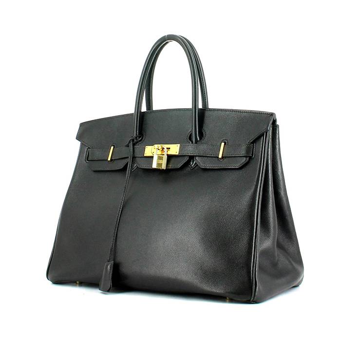 Intemporal bolso de mano "Birkin 35 cm" de cuero Gulliver negro, adorno en metal dorado, doble asa de cuero negro para llevar en la mano.