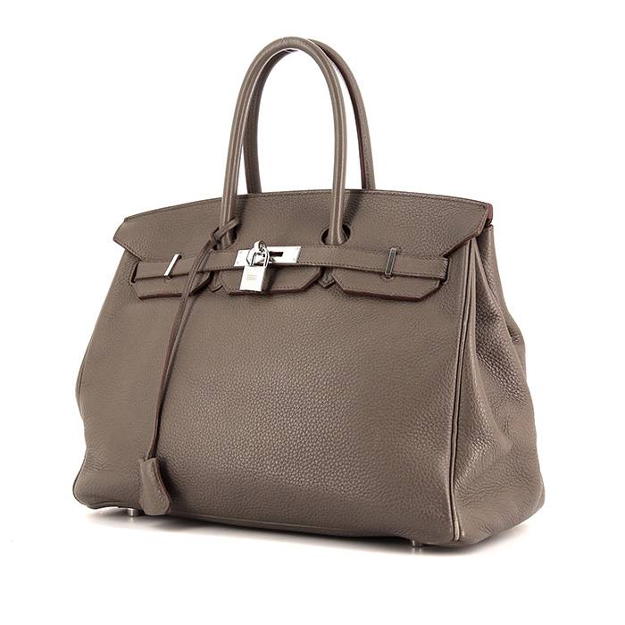 Famoso bolso de mano Hermes Birkin 35 cm de cuero taurillon clémence gris Graphite, adorno en metal plateado, doble asa de cuero gris Graphite para llevar en la mano.