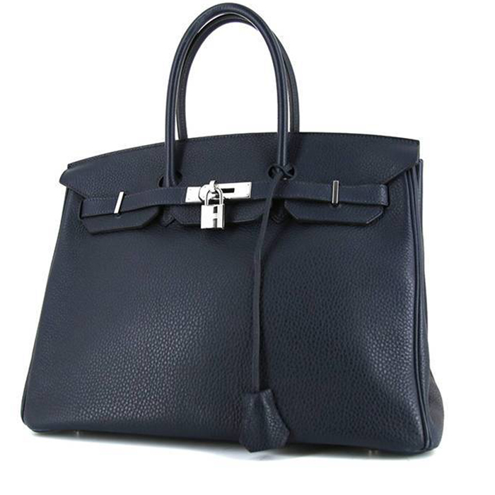 Encantador bolso de mano Hermes Birkin 35 cm de cuero togo azul marino, adorno en metal plateado paladio, doble asa de cuero azul para llevar en la mano.