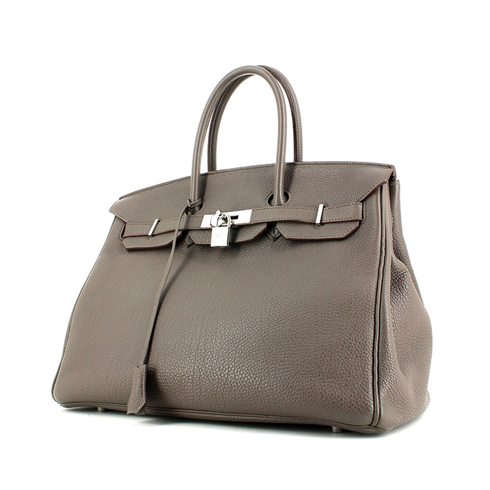 Encantador bolso de mano "Birkin 35 cm" de cuero togo gris, adorno en metal plateado, doble asa de cuero gris para llevar en la mano.