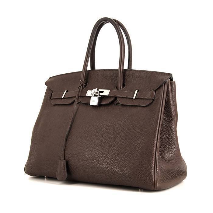 Encantador bolso de mano Hermes Birkin 35 cm de cuero togo marrón, adorno en metal plateado paladio, doble asa de cuero marrón para llevar en la mano.