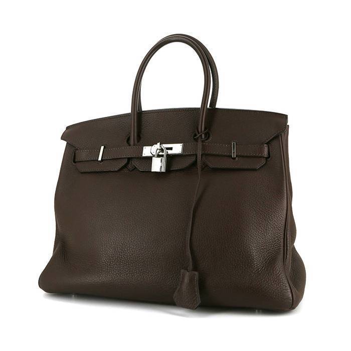 Elegante bolso de mano Hermes Birkin 35 cm de cuero togo marrón, adorno en metal plateado paladio, doble asa de cuero marrón para llevar en la mano.