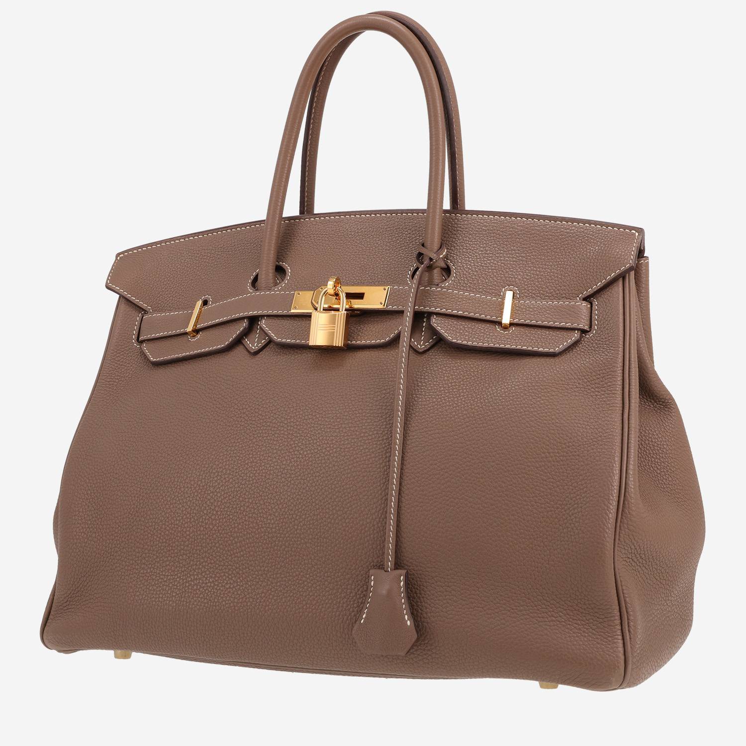 Inconfundible bolso de mano Hermès Birkin 35 cm de cuero togo etoupe, adorno en metal dorado, doble asa de cuero marrón etoupe para llevar en la mano.