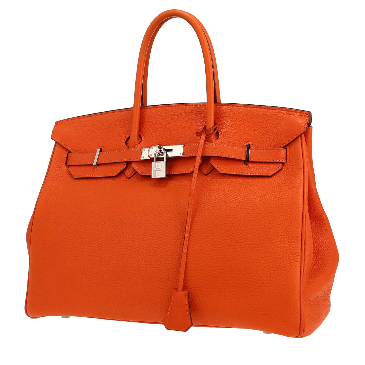 Excepcional bolso de mano Hermès Birkin 35 cm de cuero togo naranja, adorno en metal plateado paladio, doble asa de cuero naranja para llevar en la mano.