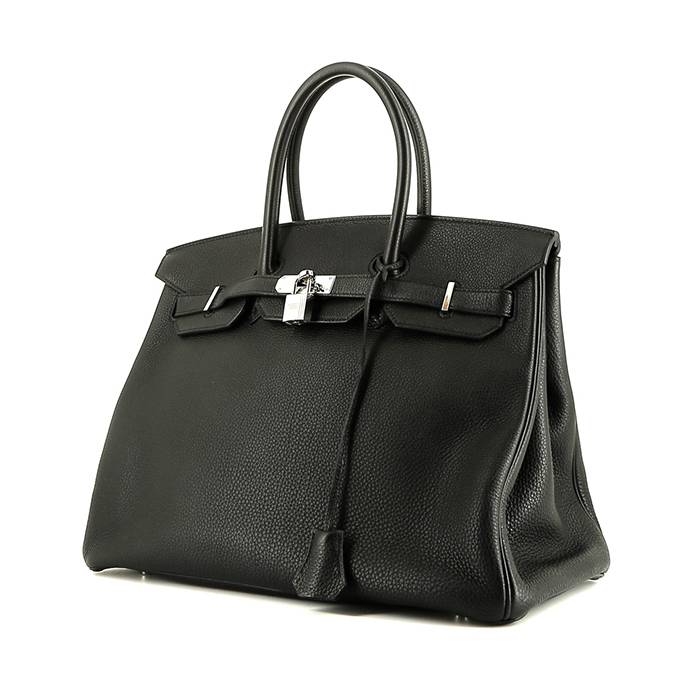Magnífico bolso de mano Hermès Birkin 35 cm de cuero togo negro, adorno en metal paladio, doble asa de cuero para llevar en la mano.