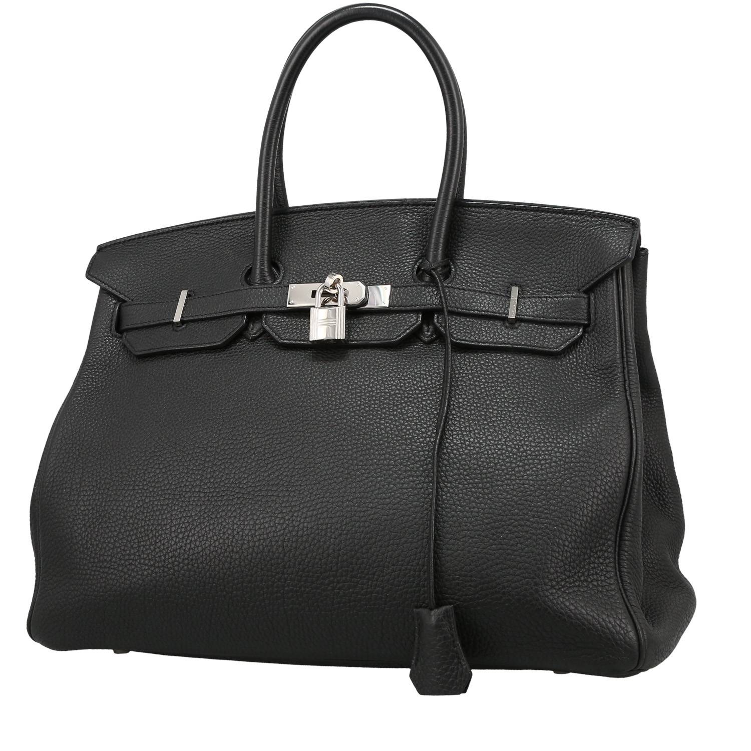 Elegante bolso de mano Hermès Birkin 35 cm de cuero togo negro, adorno en metal plateado paladio, doble asa de cuero negro para llevar en la mano.