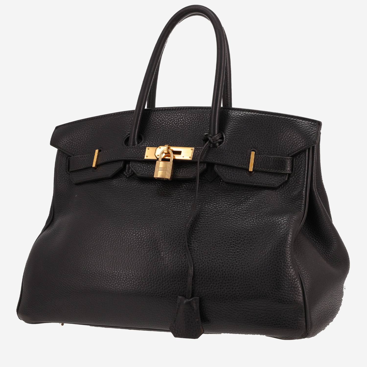 Inconfundible bolso de mano Hermès Birkin 35 cm de cuero togo negro, adorno en metal dorado, doble asa de cuero negro para llevar en la mano.