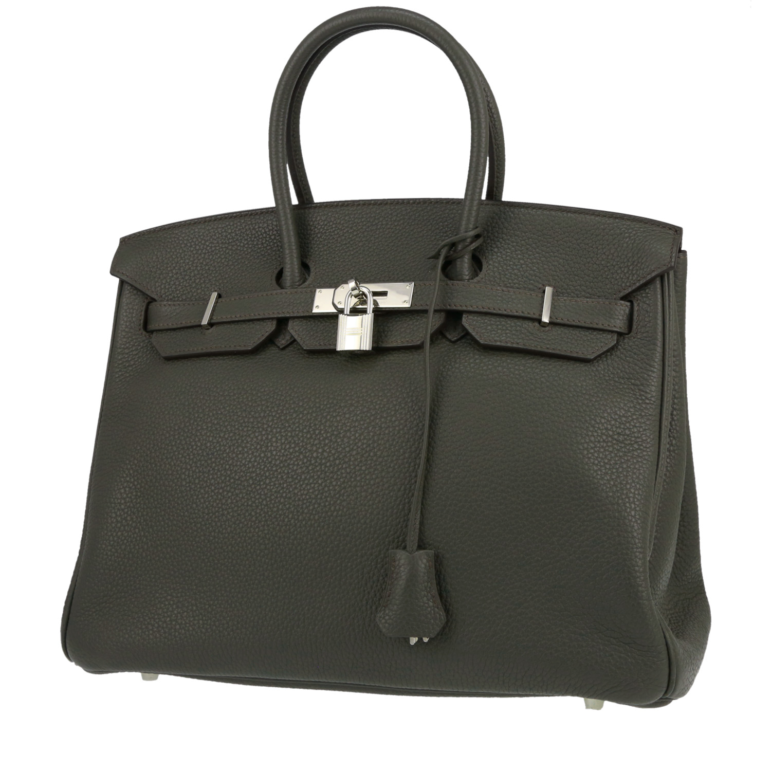 Bonito y codiciado bolso de mano Hermes Birkin 35 cm de cuero togo verde, adorno en metal plateado paladio, doble asa de cuero verde para llevar en la mano.