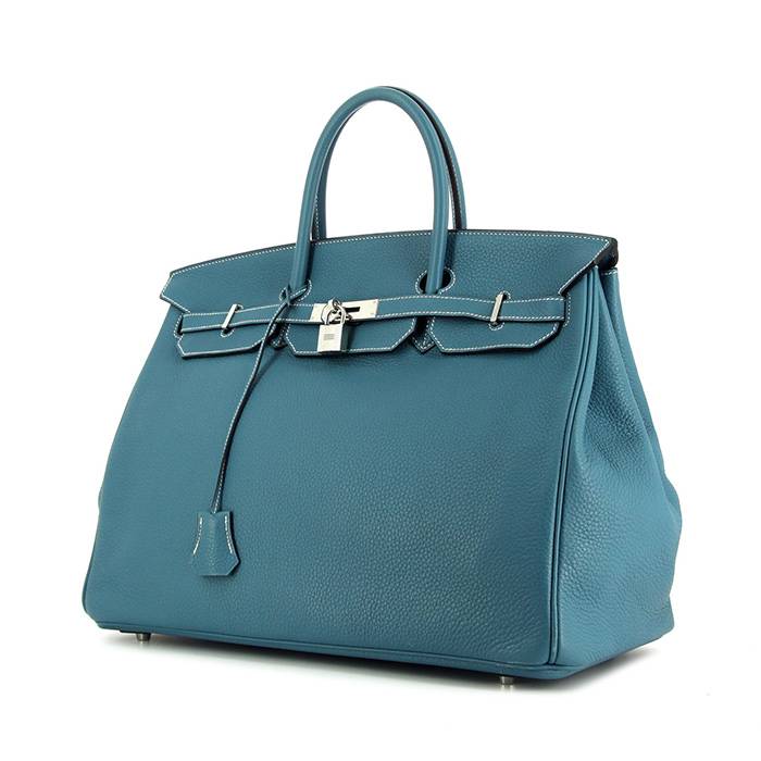 Elegante bolso de mano Hermes Birkin 40 cm de cuero togo azul, adorno en metal plateado paladio, doble asa de cuero azul para llevar en la mano.