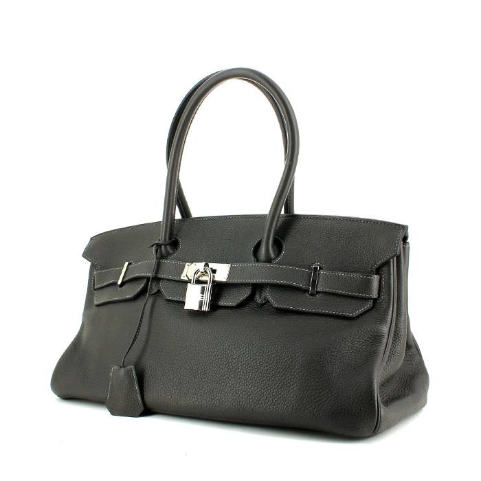 Encantador bolso de mano "Birkin Shoulder" de cuero togo gris antracita, adorno en metal plateado paladio, doble asa de cuero gris antracita para llevar en la mano o al hombro.