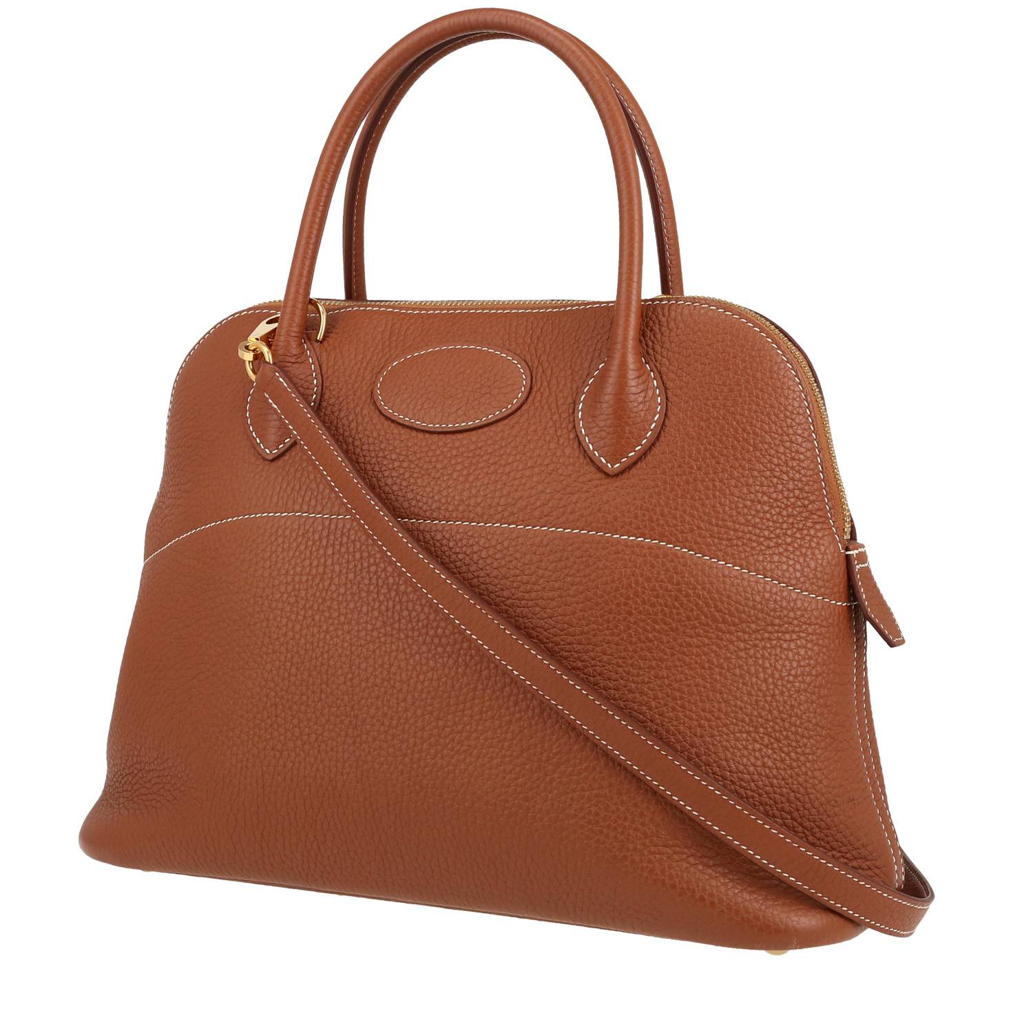Inconfundible bolso de mano Hermès Bolide 31 cm de cuero togo color oro, adorno en metal dorado, doble asa de cuero color oro, una asa extraíble de cuero color oro para llevar en la mano o al hombro.