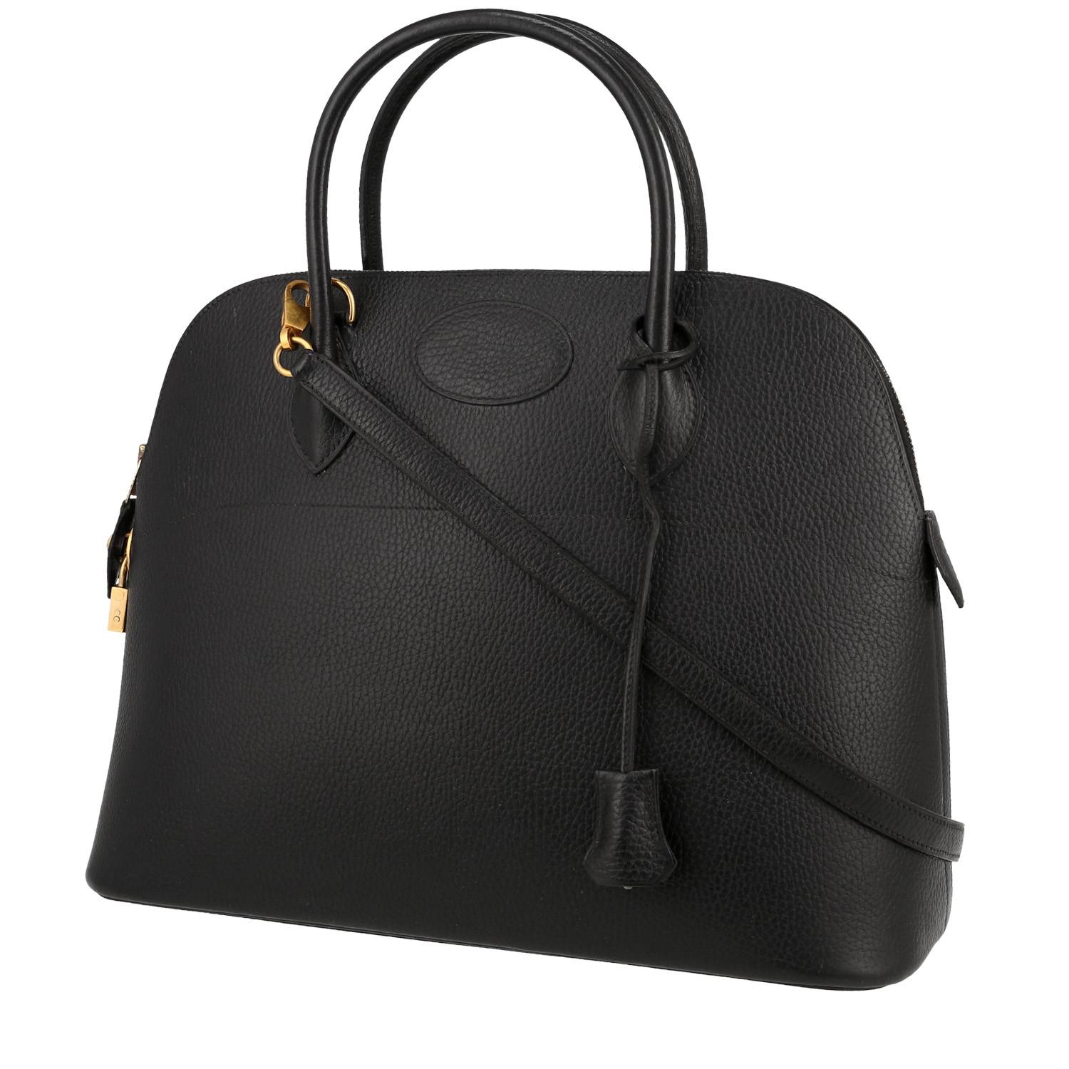 Elegante bolso de mano Hermès Bolide 35 cm de cuero Ardenne negro, adorno en metal dorado, doble asa de cuero negro, una bandolera de cuero negro para llevar en la mano o al hombro.