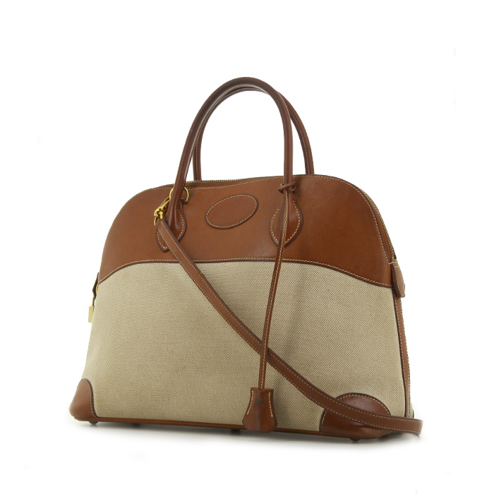Bolso de mano Hermes Bolide modelo grande en cuero Barenia color oro y lona beige crudo Ref Collector Square: 33 29 56