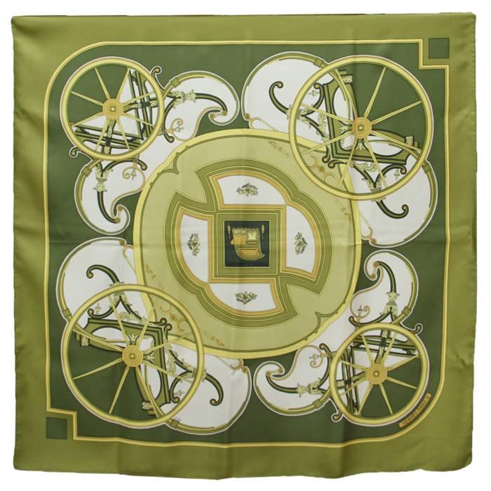 Muy bonita pañoleta cuadrada "Carre Hermes" de sarga de seda verde y beige representando una serie de enganches ecuestres.