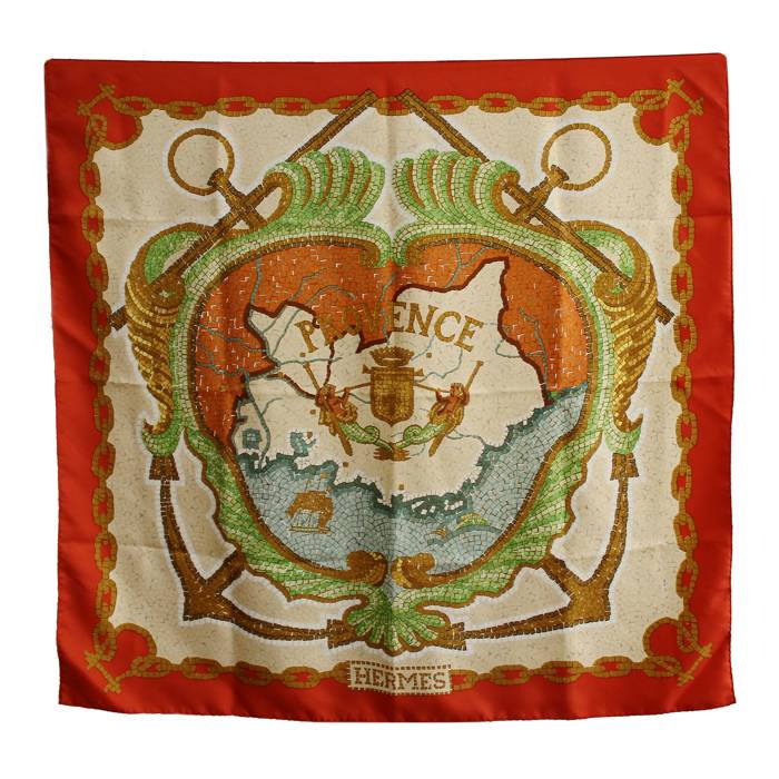 Encantador pañoleta cuadrada "Provence" de sarga de seda roja y beige con decoración marinera.