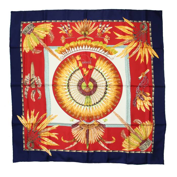 Pañoleta cuadrada Carre Hermes en sarga de seda roja y azul con decoración de plumas Ref Collector Square: 26 20 98
