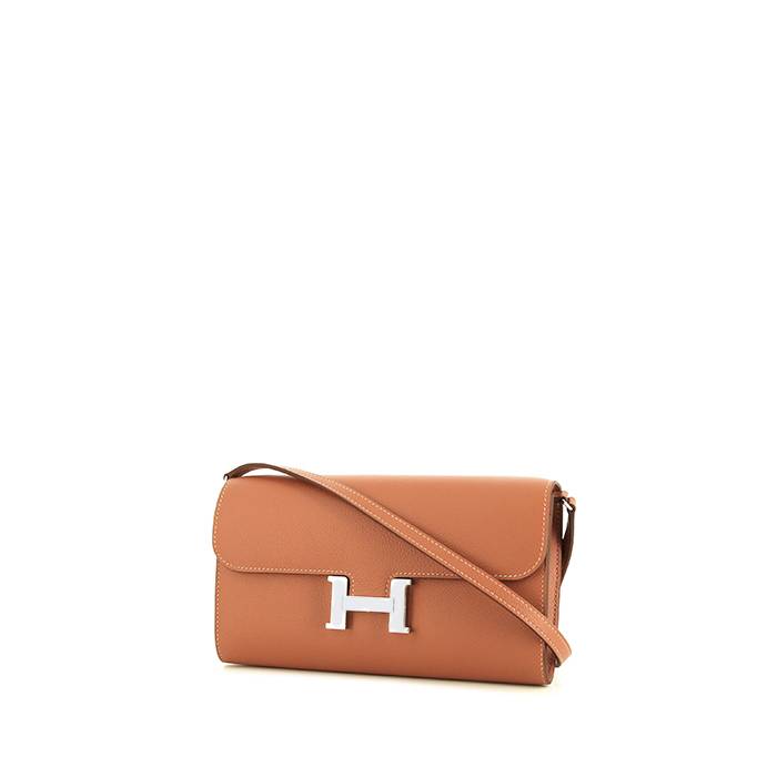 Elegante bolsito de mano Hermès Long To Go de cuero togo marrón Blush, adorno en metal plateado paladio, una bandolera extraíble de cuero marrón para llevar en la mano o colgado al hombro o cruzado.