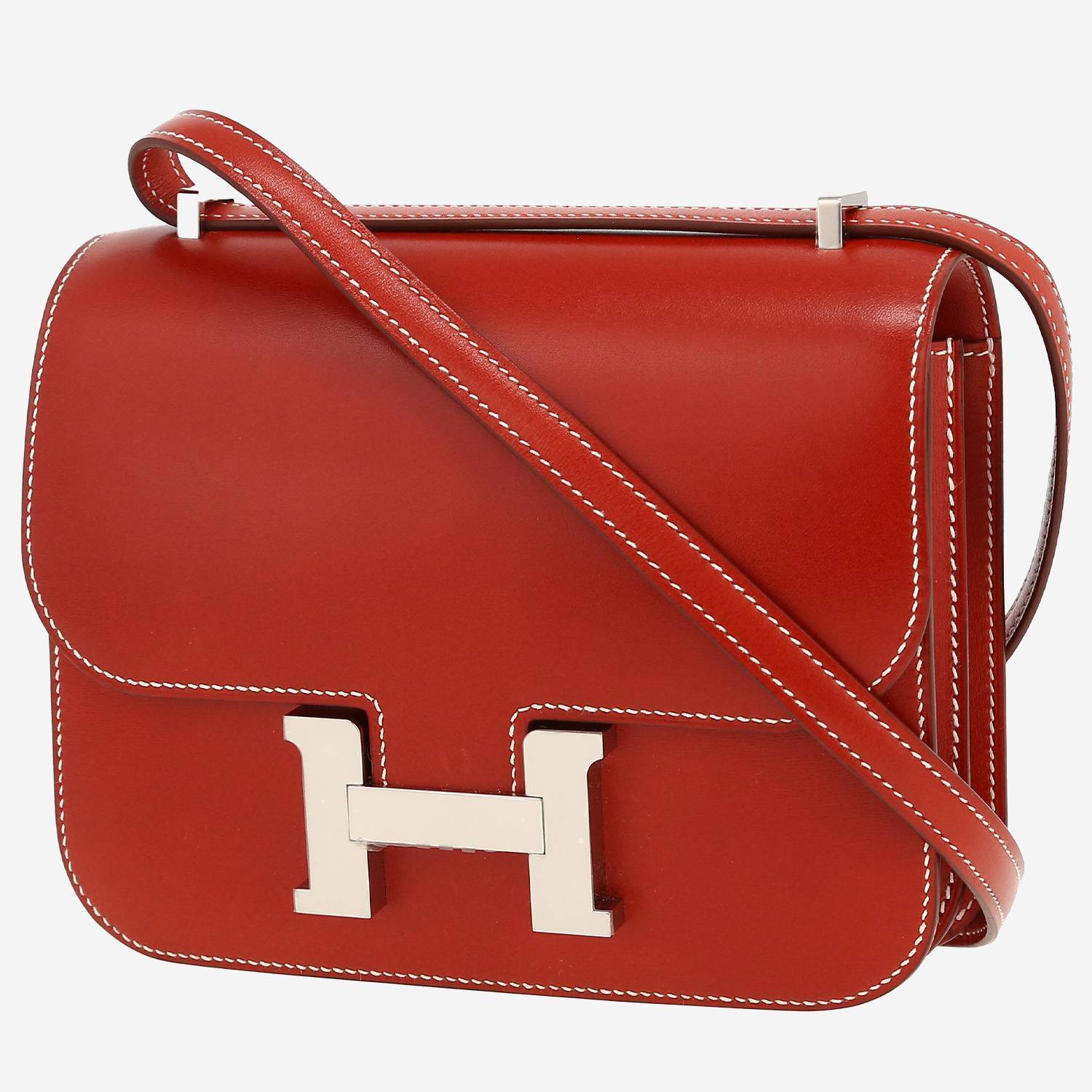 Famoso bolso bandolera Hermès Constance mini de cuero box rojo ladrillo, adorno en metal paladio, pespuntes blancos, asa ajustable de cuero box rojo ladrillo para llevar al hombro o cruzado.