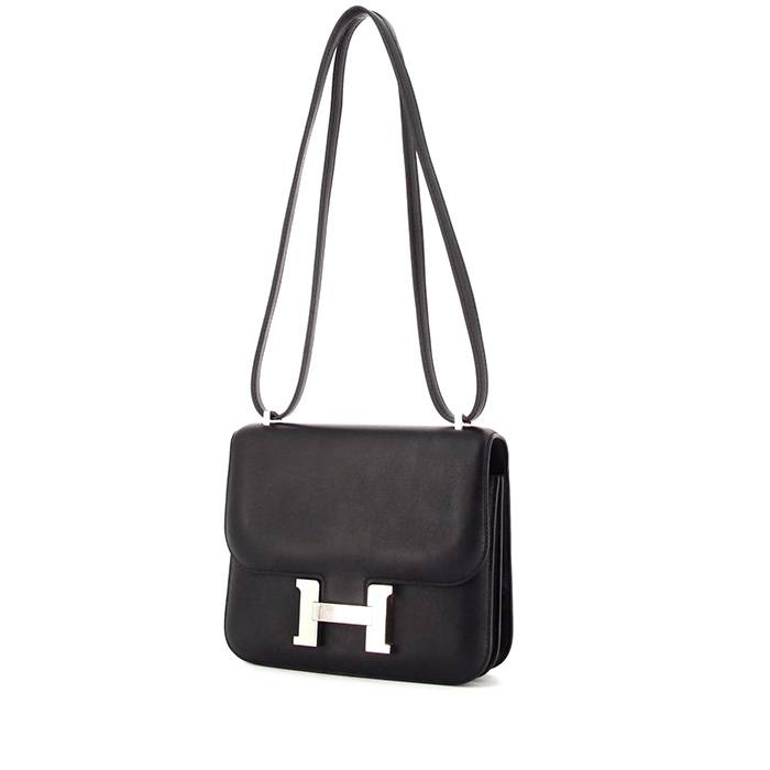 Encantador bolso bandolera Hermes Hermes Constance modelo pequeño de cuero swift negro, adorno en metal paladio, asa ajustable de cuero negro para llevar al hombro o cruzado.