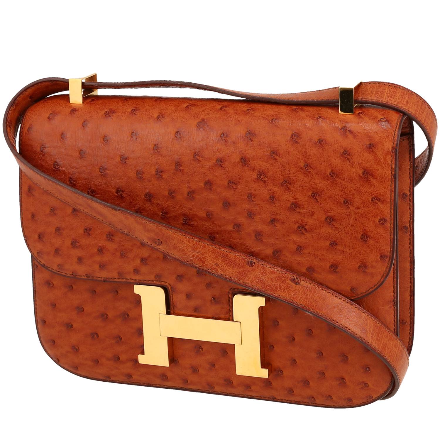 Elegante bolso de mano Hermès Constance de avestruz color coñac, adorno en metal dorado, una asa ajustable de avestruz color coñac para llevar en la mano o al hombro.