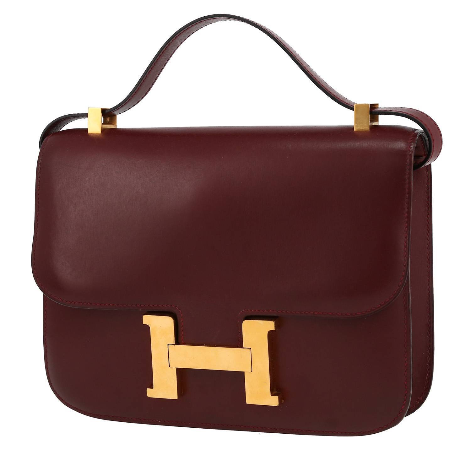 Elegante bolso de mano Hermès Constance de cuero box color burdeos, adorno en metal dorado, asa ajustable de cuero color burdeos para llevar en la mano o al hombro.