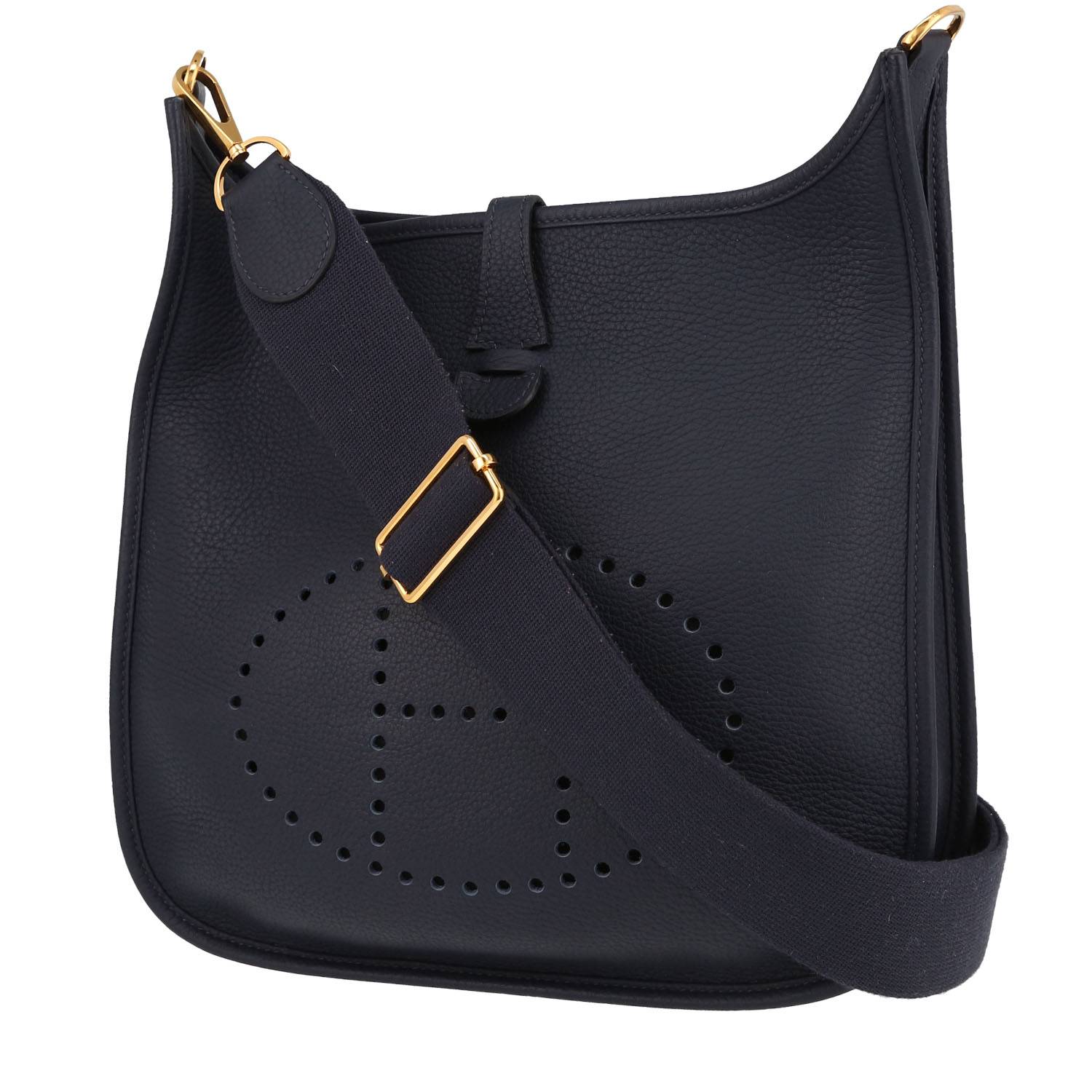 Inconfundible bolso bandolera Hermès Evelyne de cuero togo azul, adorno en metal dorado, una bandolera extraíble de lona azul para llevar al hombro o cruzado.