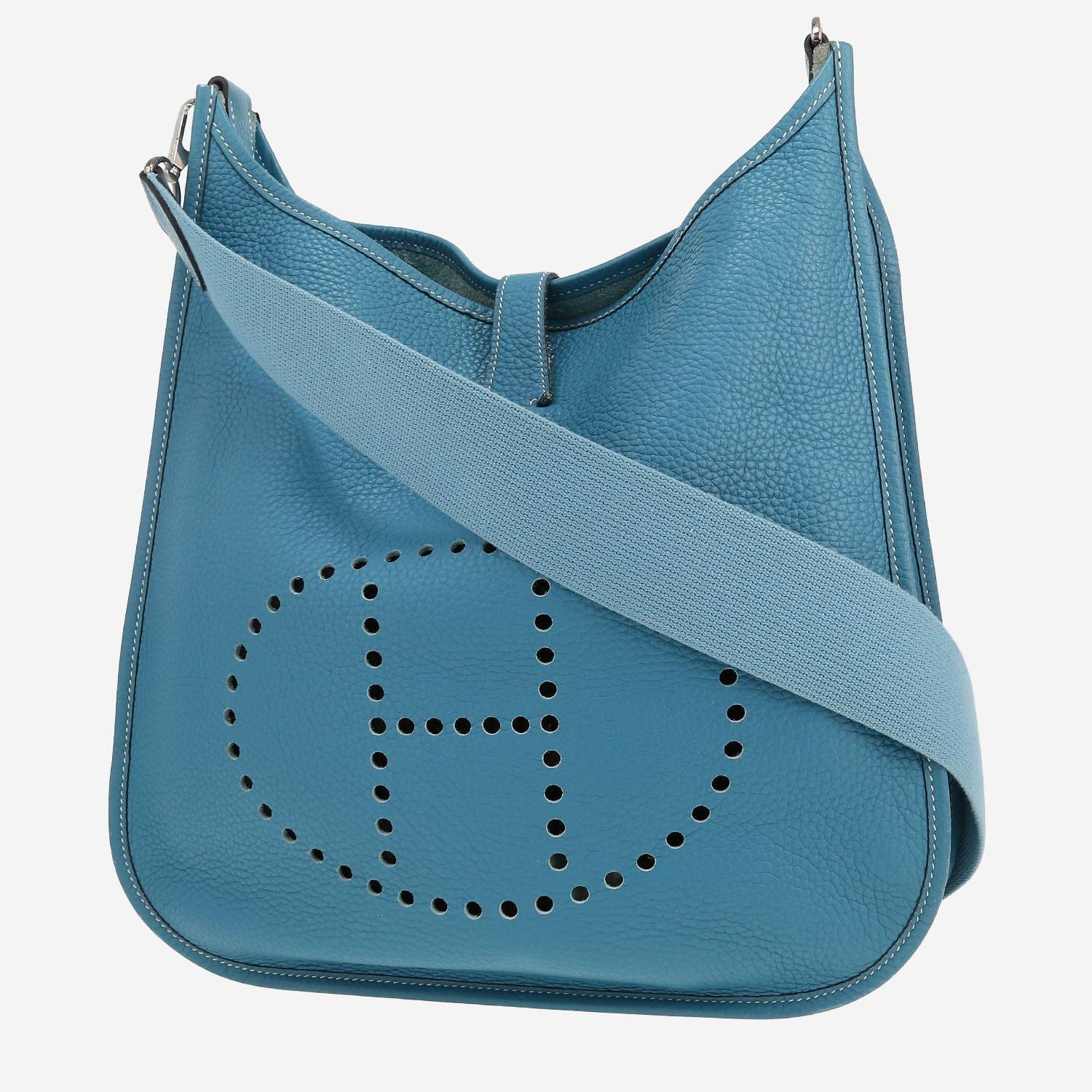 Elegante bolso bandolera Hermès Evelyne de cuero togo azul, adorno en metal plateado paladio, una bandolera extraíble de lona azul para llevar al hombro o cruzado.