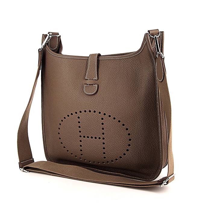Famoso bolso bandolera Hermes Evelyne de cuero togo marrón etoupe, adorno en metal plateado paladio, pespunte guarnicionero blanco, una asa ajustable de lona marrón etoupe para llevar al hombro o cruzado.