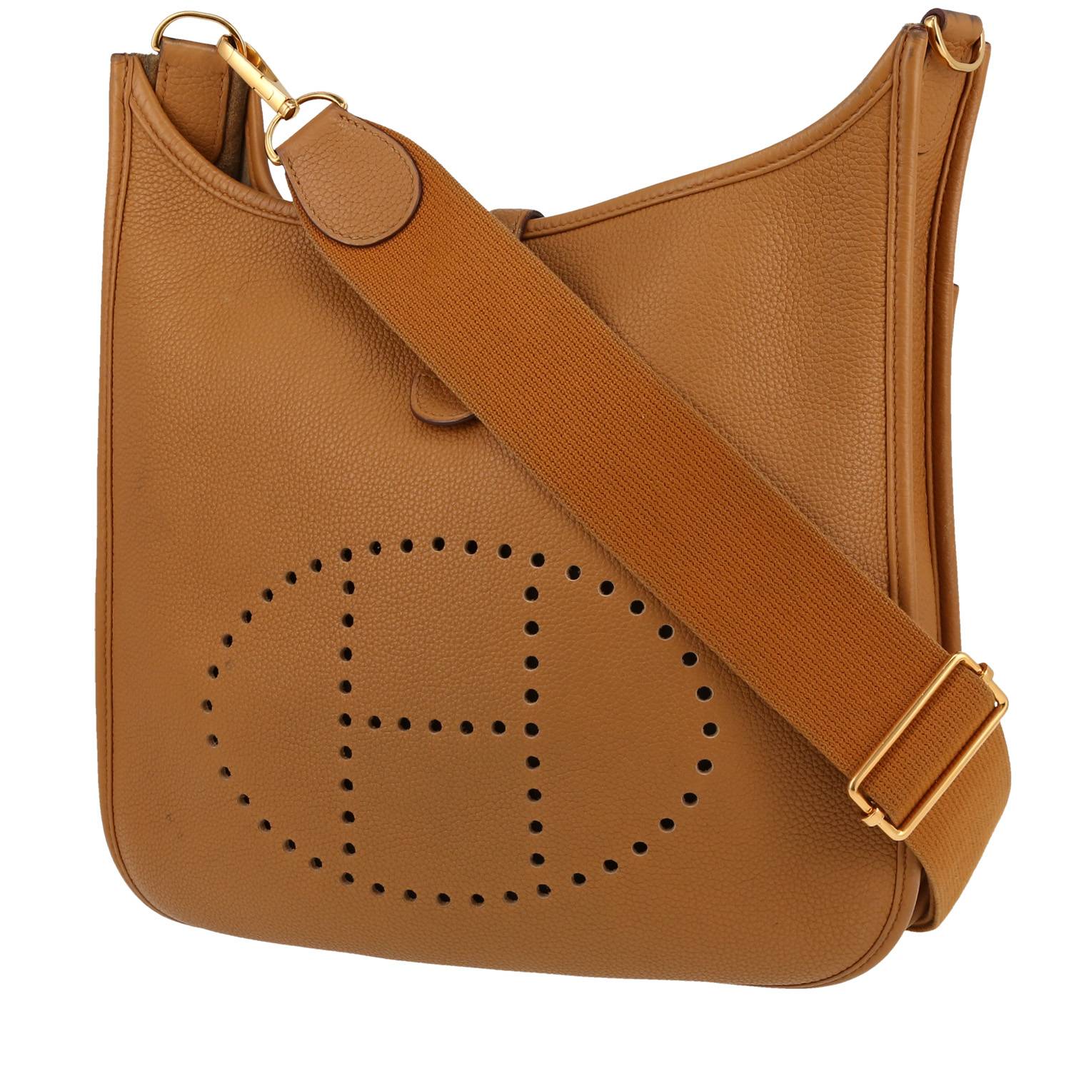 Magnífico bolso bandolera Hermès Evelyne III de cuero togo Sesame, adorno en metal dorado, bandolera extraíble y ajustable de lona marrón para llevar al hombro o cruzado.