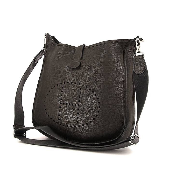 Encantador bolso bandolera Hermes Evelyne modelo grande de cuero granulado gris oscuro, adorno en metal paladio, una asa extraíble de lona gris para llevar al hombro o cruzado.