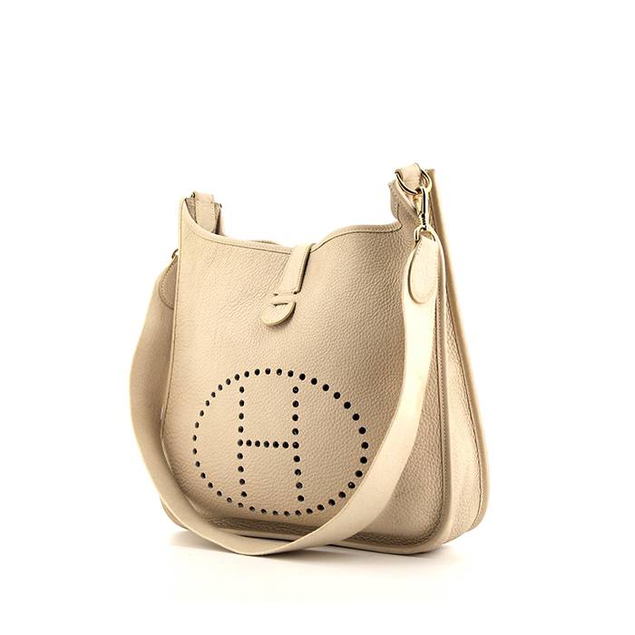 Bolso bandolera Hermes Evelyne modelo mediano de cuero togo beige crudo, adorno en metal dorado, una asa extraíble de lona beige crudo para llevar al hombro o cruzado.
