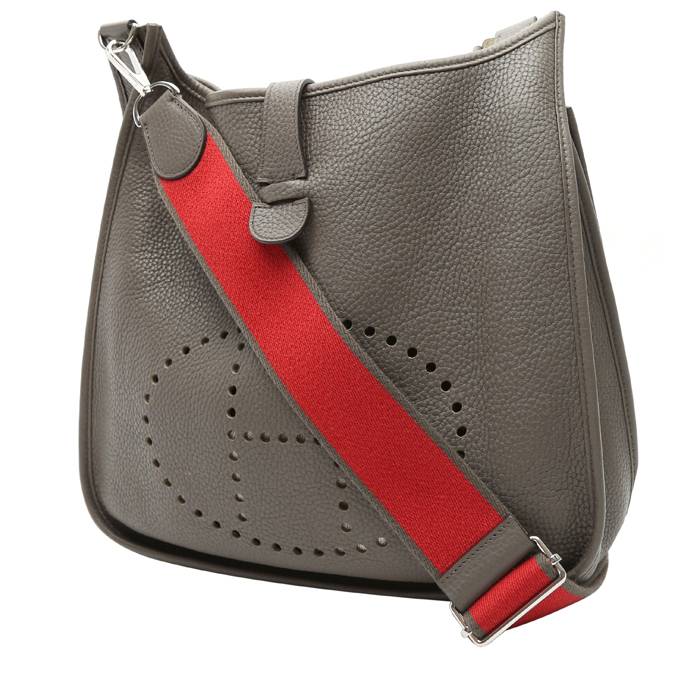 Inconfundible bolso bandolera Hermès Evelyne modelo mediano de cuero togo gris, adorno en metal plateado paladio, una bandolera extraíble y ajustable de lona bicolor para llevar al hombro o cruzado.