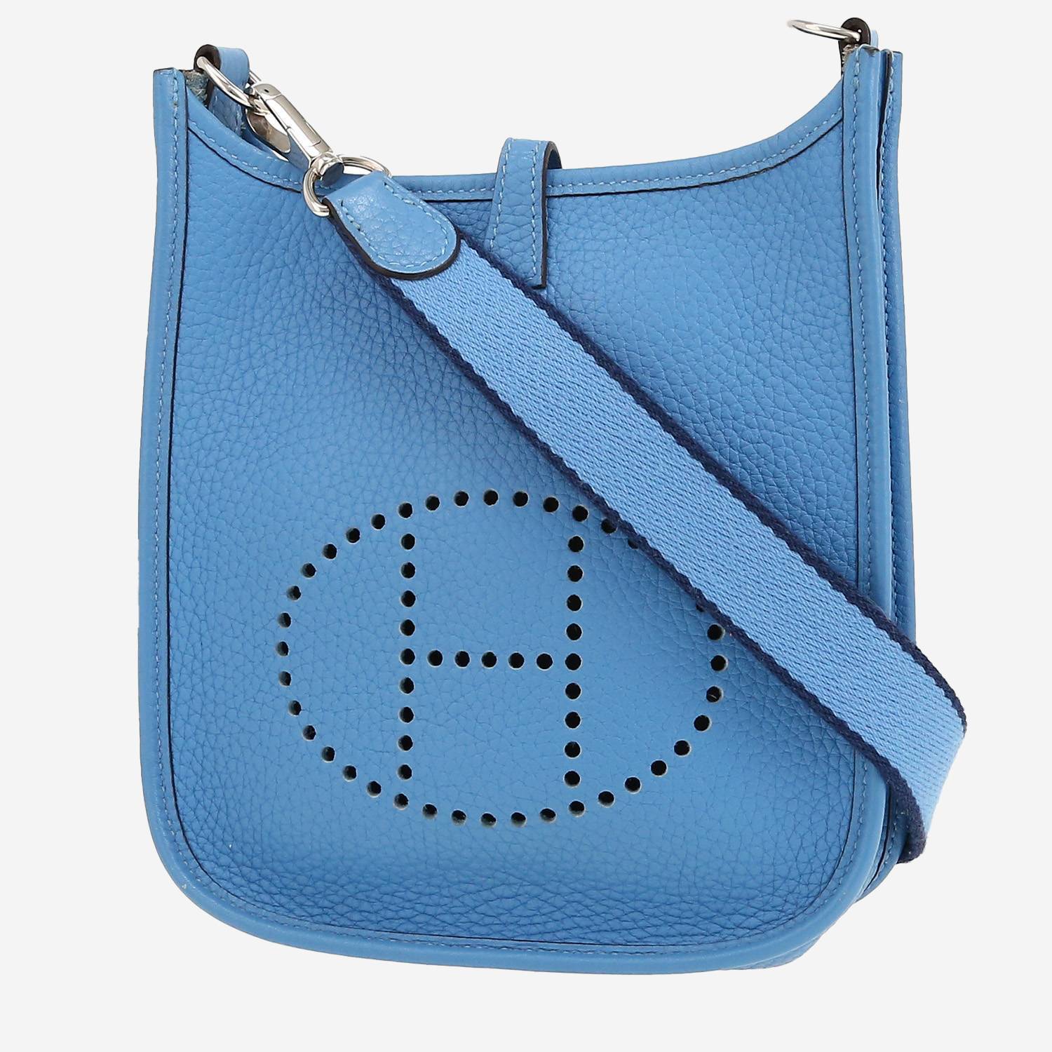 Magnífico bolso bandolera Hermès Mini Evelyne de cuero taurillon clémence Bleu Paradis, adorno en metal plateado paladio, bandolera extraíble de lona Bleu Paradis para llevar al hombro o cruzado.