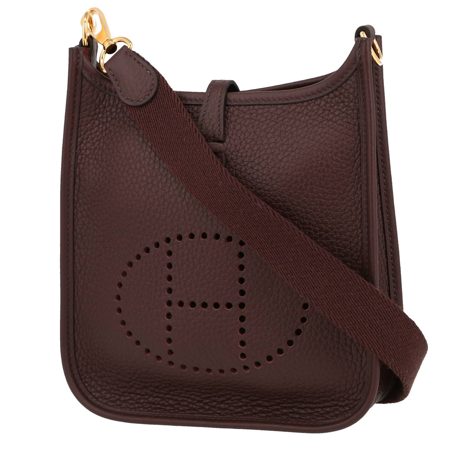 Magnífico bolso bandolera Hermès Mini Evelyne de cuero taurillon clémence rojo H, adorno en metal dorado, bandolera extraíble de lona rojo H para llevar al hombro o cruzado.