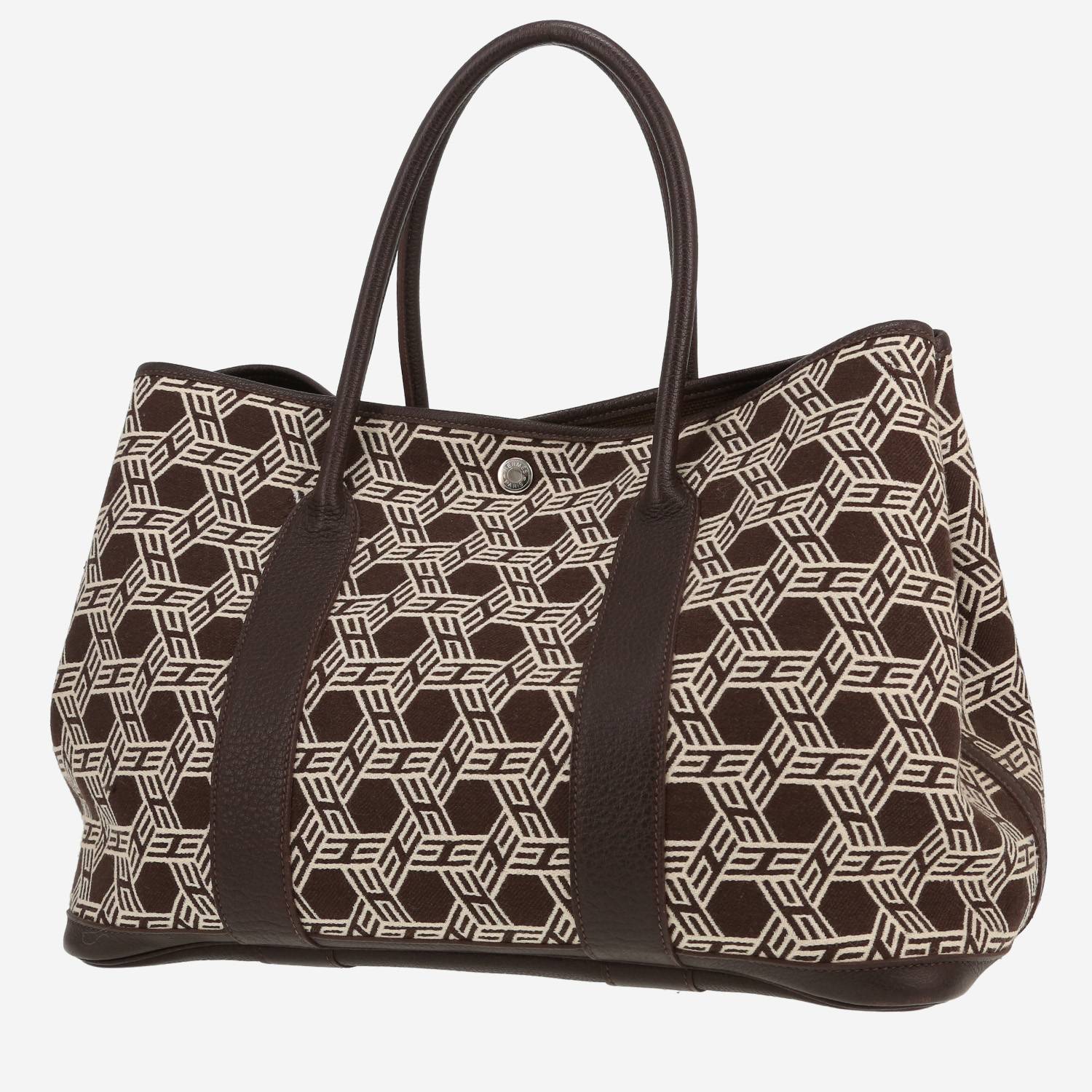 Magnífico bolso de mano Hermès Garden Party 36 cm de lona marrón estampado y cuero marrón, adorno en metal plateado paladio, doble asa de cuero marrón para llevar en la mano o al hombro.