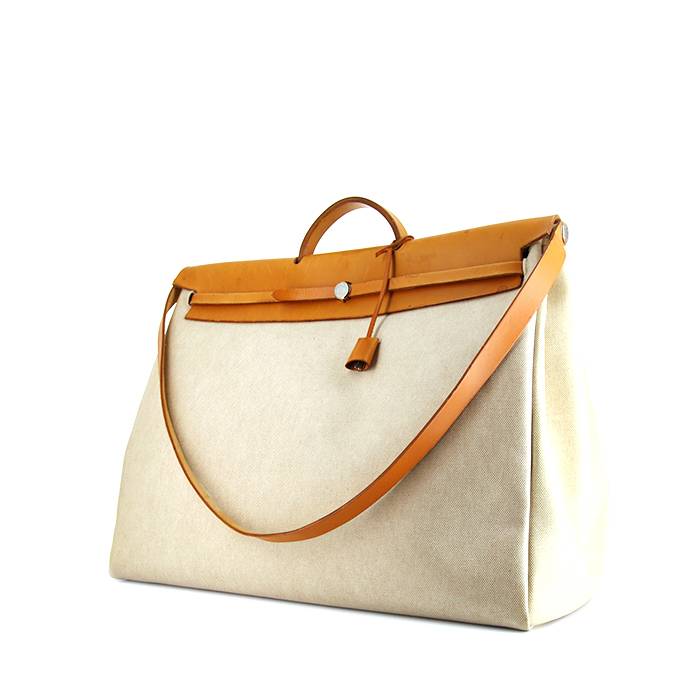 Práctica bolsa de viaje Hermes Herbag modelo grande de lona beige y de cuero natural, adorno en metal plateado paladio, asa de cuero natural, bandolera de cuero natural para llevar en la mano o al hombro.