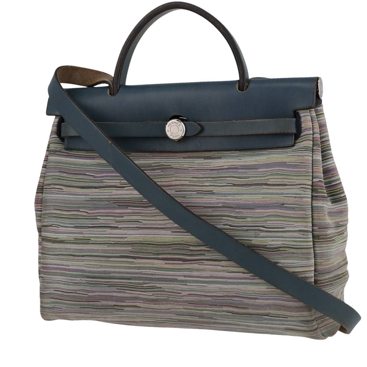 Elegante bolso para llevar al hombro o en la mano Hermès Herbag de cuero vibrato gris azul y violeta y cuero azul, adorno en metal plateado paladio, asa de cuero azul, una asa de cuero azul para llevar en la mano o colgado al hombro o cruzado.