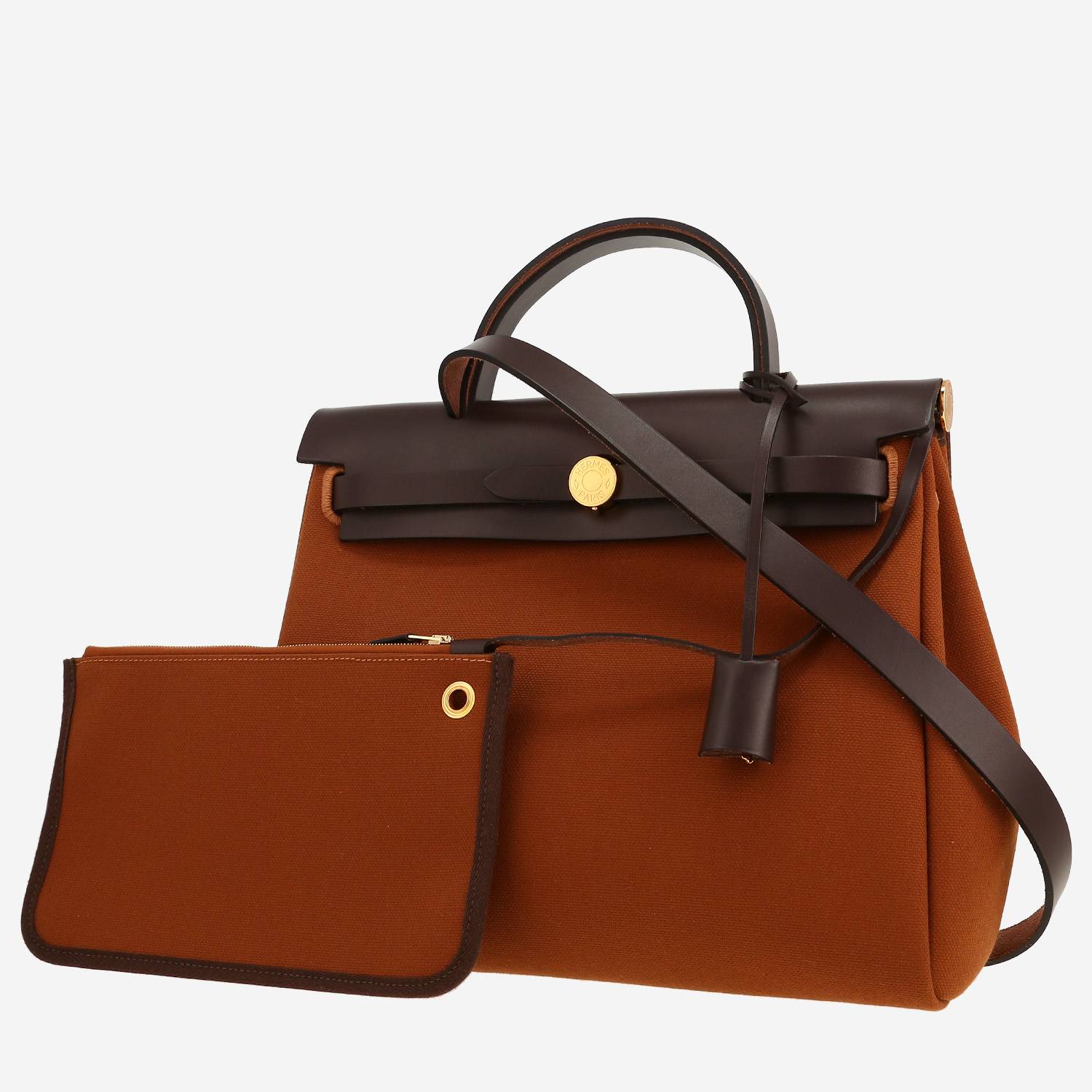 Magnífico bolso para llevar al hombro o en la mano Hermès Herbag de lona rojizo y cuero ébano, adorno en metal dorado, asa sencilla de cuero ébano, bandolera extraíble de cuero ébano para llevar en la mano o al hombro.