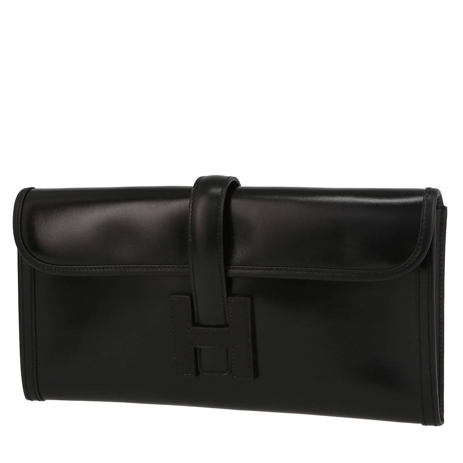 Famoso bolsito de mano Hermès Jige de cuero box negro para llevar en la mano.