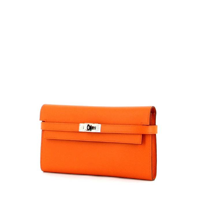 Magnífica billetera Hermes de cuero epsom naranja, adorno en metal paladio, llevar en la mano.