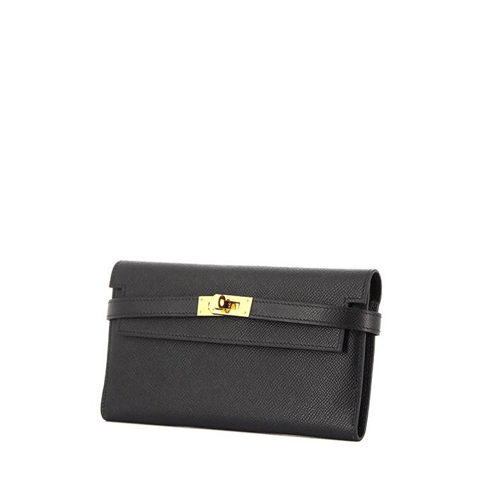 Elegante billetera Hermes Kelly - Pocket Hand de cuero epsom negro, adorno en metal dorado, pespunte guarnicionero negro, llevar en la mano.