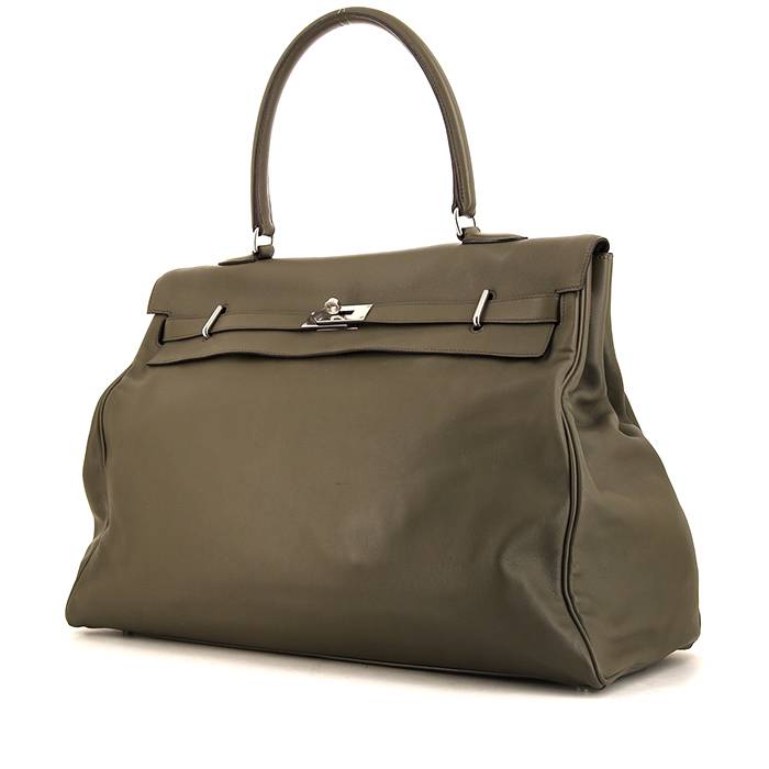 Original bolsa de viaje Hermès Relax Kelly de cuero swift gris verdoso, adorno en metal paladio, asa de cuero gris verdoso para llevar en la mano o al hombro.