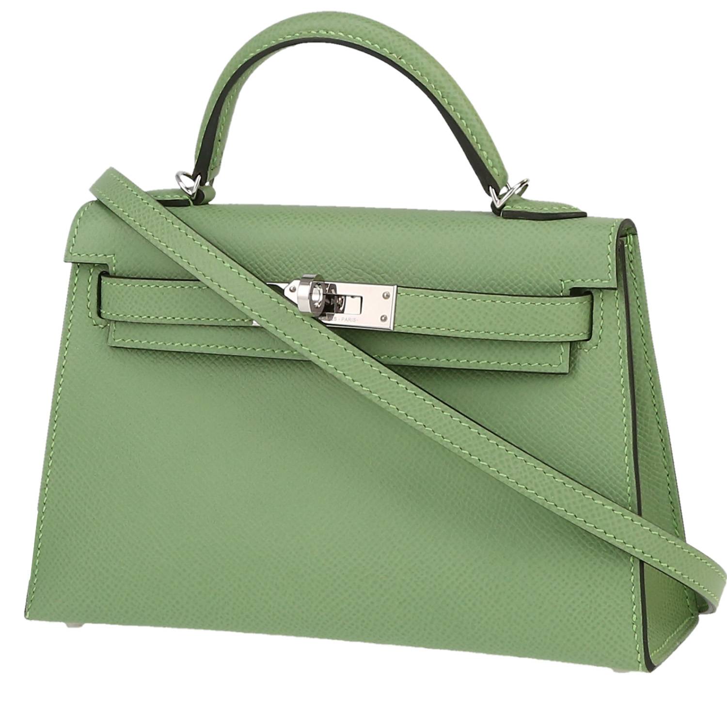 Magnífico bolso de mano Hermès Kelly 20 cm de cuero epsom Vert Criquet, adorno en metal plateado paladio, asa de cuero epsom verde, una asa extraíble de cuero epsom verde para llevar en la mano o colgado al hombro o cruzado.