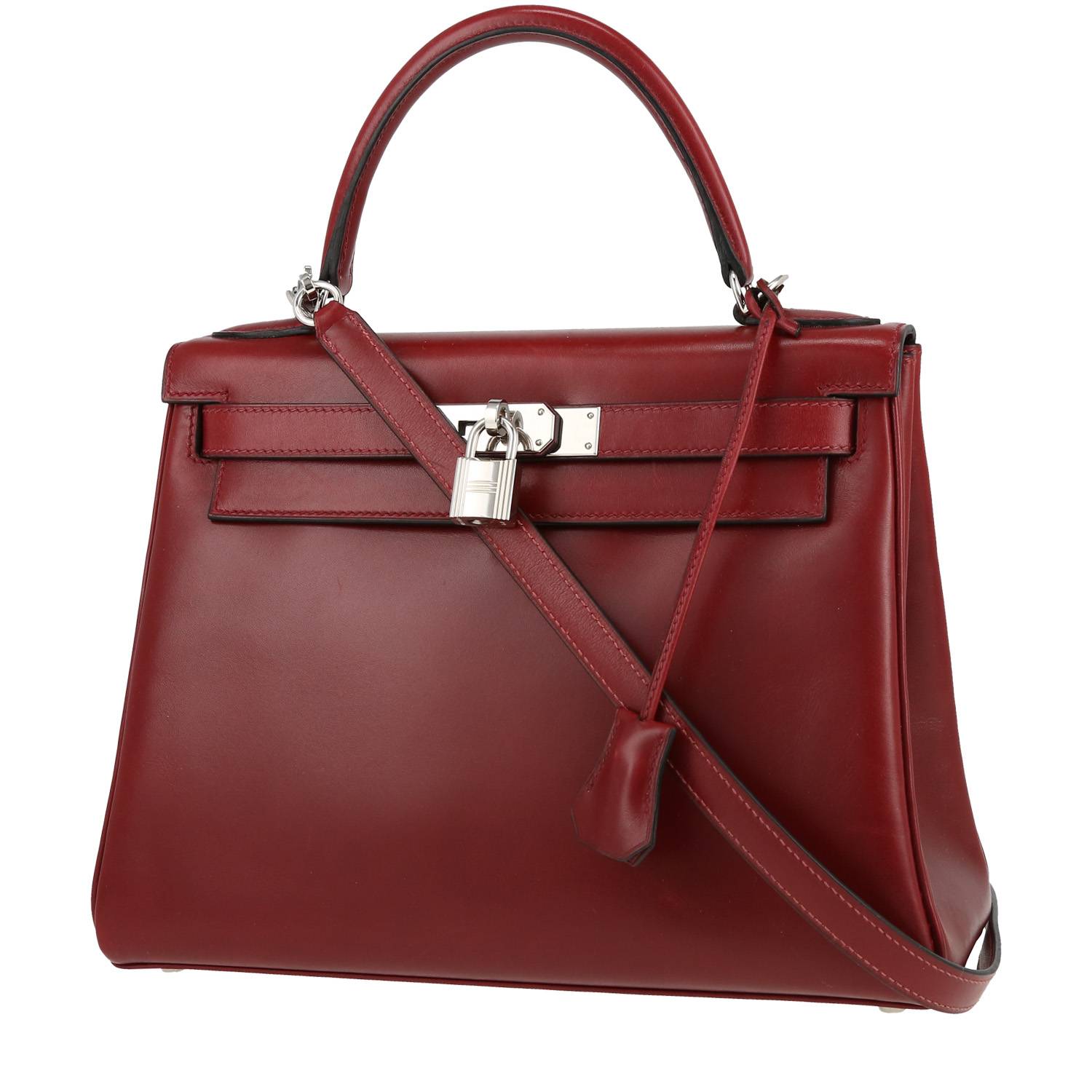 Magnífico bolso de mano Hermès Kelly 28 cm de cuero box color burdeos, adorno en metal plateado paladio, asa sencilla de cuero color burdeos, bandolera extraíble de cuero color burdeos para llevar en la mano o al hombro.