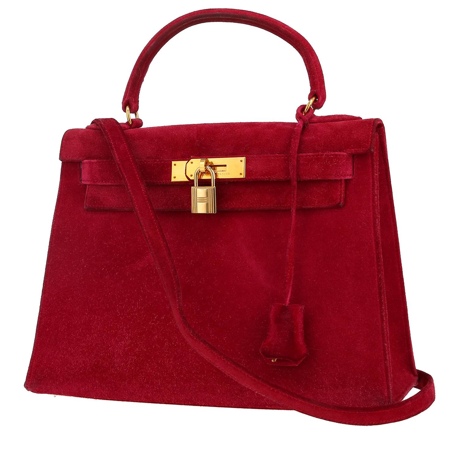 Elegante bolso de mano Hermès Kelly 28 cm de cuero de ternero doblis color frambuesa, adorno en metal dorado, asa sencilla de cuero de ternero doblis color frambuesa, bandolera extraíble de cuero color frambuesa para llevar en la mano o al hombro.