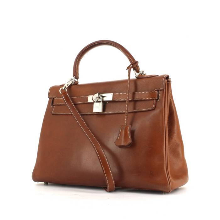 Magnífico bolso de mano "Kelly 32 cm" de cuero Barenia marrón, adorno en metal cepillado, sobrecosturas blancas, asa sencilla de cuero marrón, bandolera de cuero Barenia marrón para llevar en la mano o al hombro.
