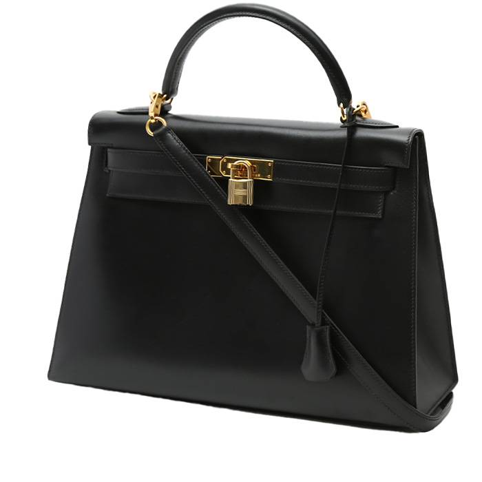 Precioso bolso de mano Hermès Kelly 32 cm de cuero box negro, adorno en metal dorado, asa de cuero box negro, bandolera extraíble de cuero negro para llevar en la mano o al hombro.